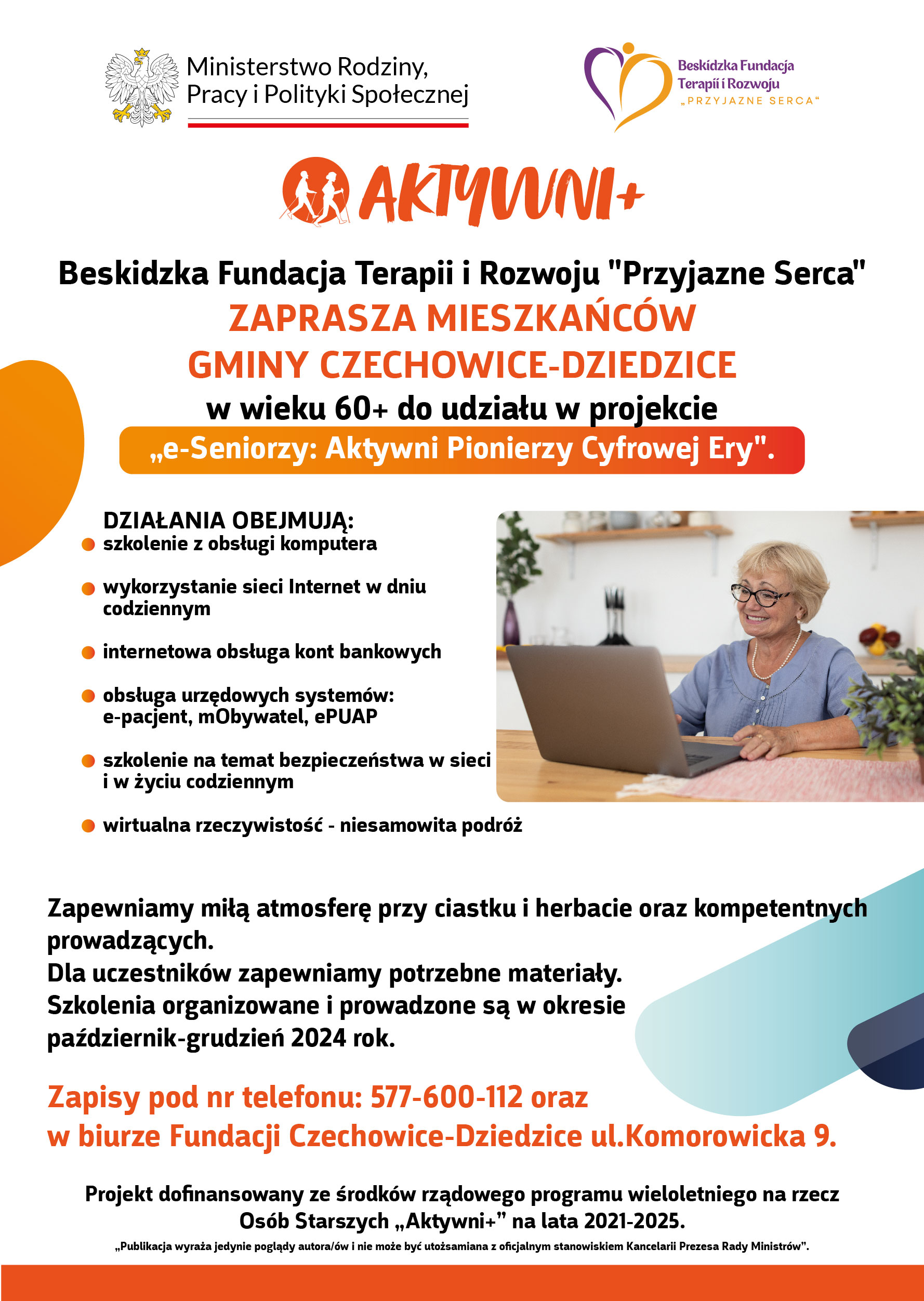 Zapraszamy serdecznie wszystkich w wieku 60+ z terenu gminy Czechowice-Dziedzic na bezpłatne, stacjonarne szkolenie z Naszego projektu. Szczegółowe informacje na plakacie.